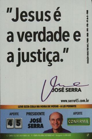 É inacreditável o nível de desfaçatez que tomou a exploração religiosa na campanha de José Serra. Por acaso esse santinho não é a utilização mais descarada é farisaica do nome de Cristo em favor de uma candidatura.